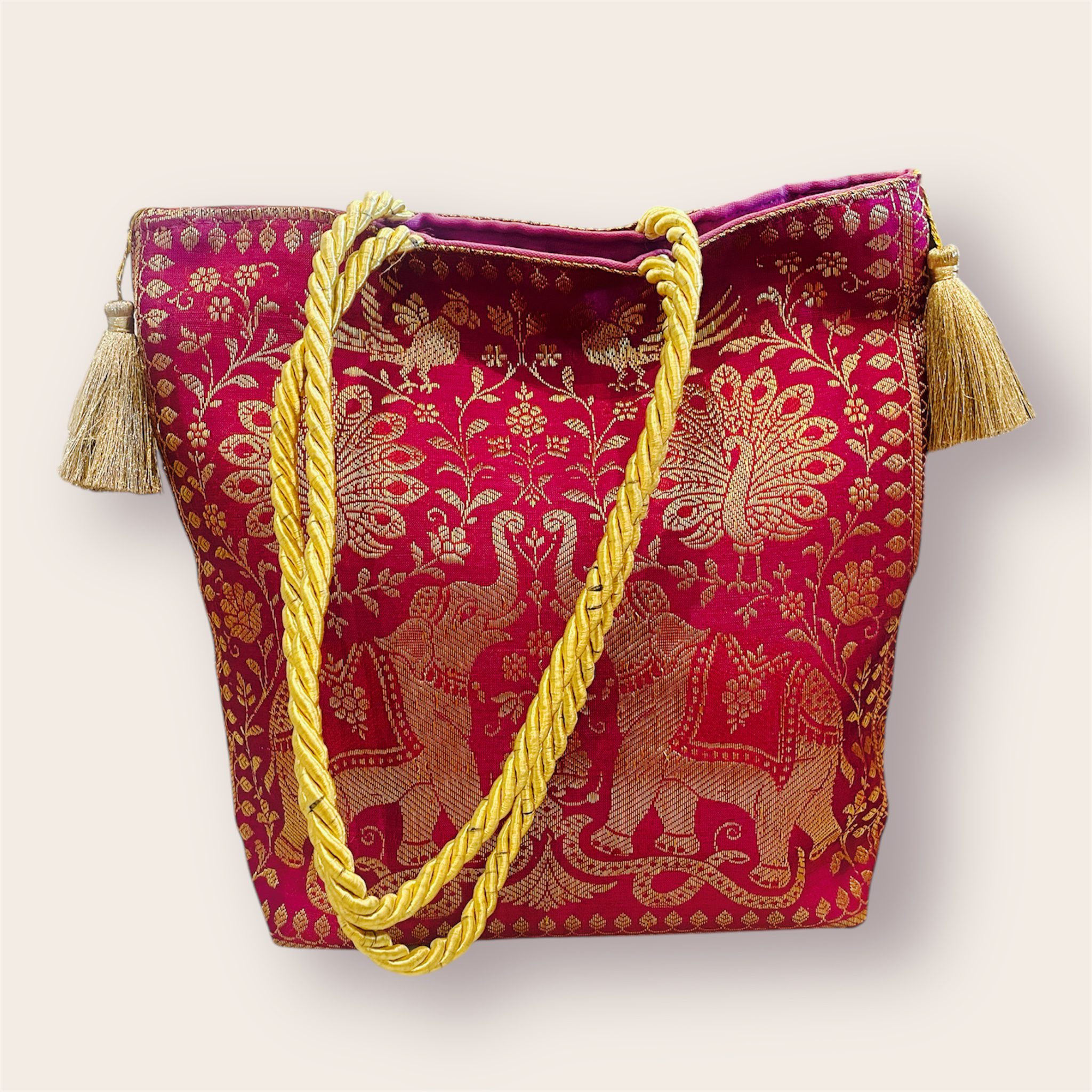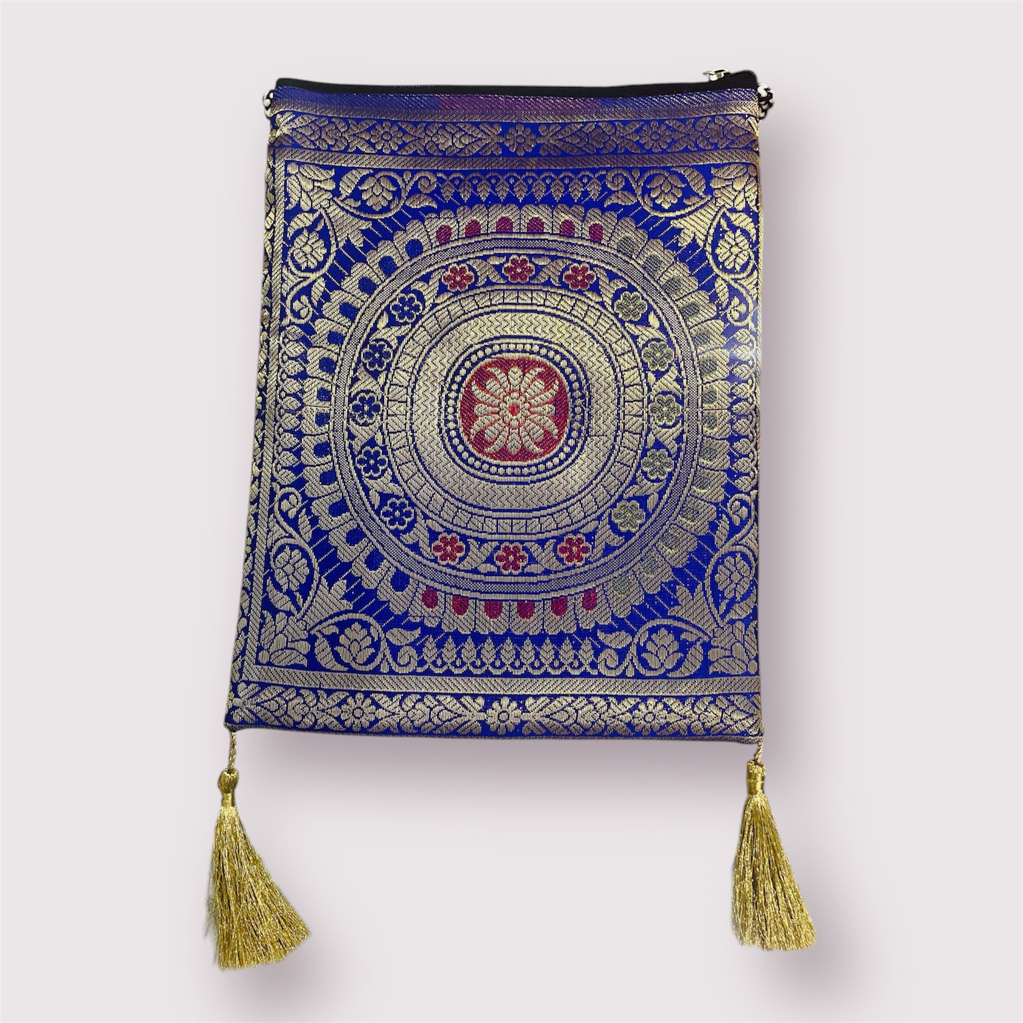 This large, colorful oriental-style bag is a stunning accessory that combines functionality with artistic flair. Crafted with intricate patterns and vibrant hues, it features elegant tassels that add a touch of sophistication.